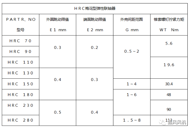 3、連接的兩軸應(yīng)盡可能同心:須接照圖標檢測聯(lián)軸器的殼罩外圓和端面的跳動E1 、E2,跳運值應(yīng)符合表中規(guī)定值以內(nèi)。